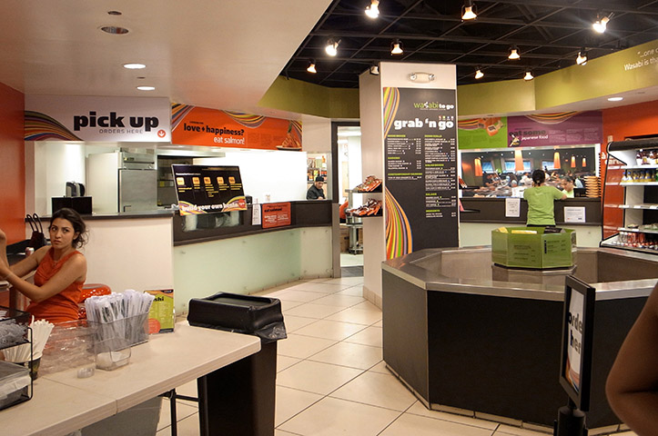 Full brand identification for kaiten style modern japanese restaurant including logo, signage, Railing design, sneezeguard graphics, super graphics, packaging uniforms, menus, take out bags, advertising, and website.